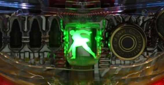図柄揃い後に発生するラウンド決定演出。まず、左打ちで上アタッカーに玉を入れると、玉がドラムの中リール下部へ移動。次に、リール役物によって玉が上昇し、最終的に「BIG」の穴に入れば6Ror15R、「SMALL」の穴に入れば3Rの大当りとなる。