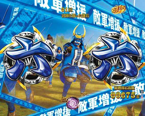 敵軍を撃破できれば大当り!? 部隊の種類(槍<騎馬<鉄砲<大砲)で信頼度が変化するぞ。特に大砲隊は大チャンスだ。援軍演出発生時はリーチが昇格する!? 他にもタイトルやエフェクトにも注目しよう。
