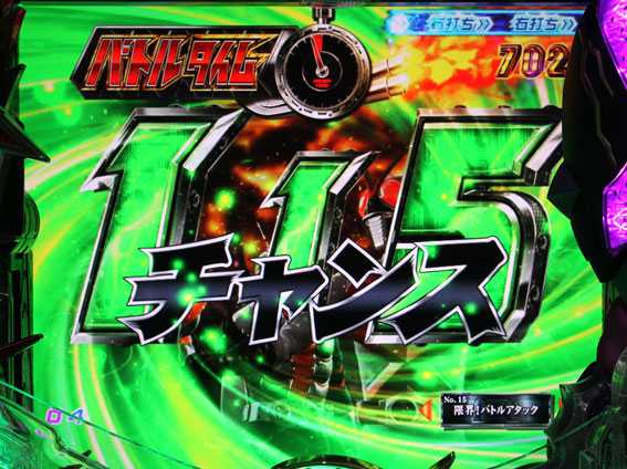 通常時のリーチハズレ後などに発生。ラウンド中はアタッカーに玉が入賞して獲得出玉数の色が変わるとチャンスで、最終的にボタンPUSHでバトルタイムロゴが完成すれば4回転のバトルタイムに突入。なお、演出失敗時は通常時に戻る。