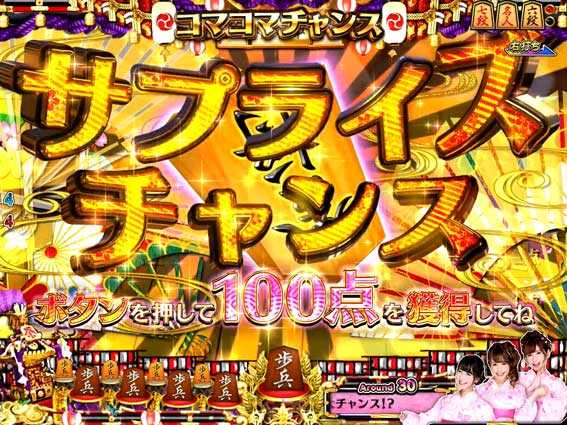 16R以外の初当り後に突入する10回転ST。液晶では駒をふって点数を獲得する専用演出が展開し、合計点が100点になれば大当りだ。10回転以内に当たらないと通常背景に戻るが、4回転の間は潜伏確変となる。また、電サポ抜け残り保留で大当りした場合は、16Rでない限り再びコマコマチャンスへ移行するぞ。
