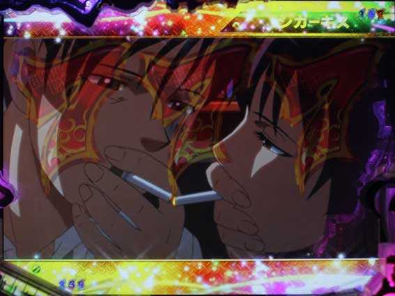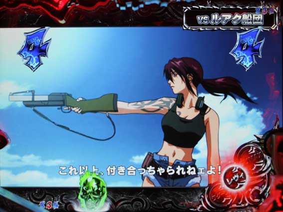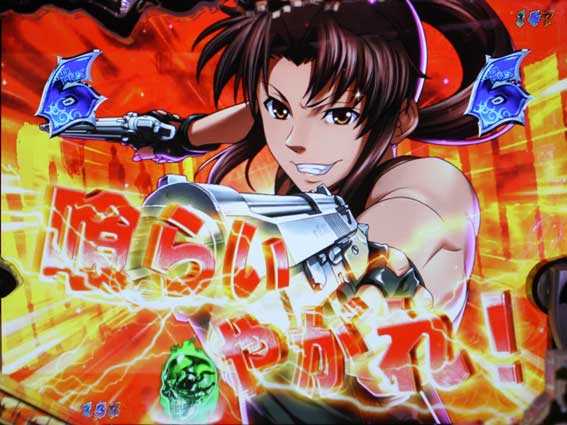 連続予告4回などから発展。レヴィとロックのやりとりと共に図柄が全回転で移行する。7図柄大当り濃厚!?