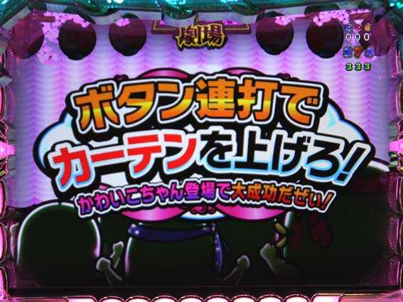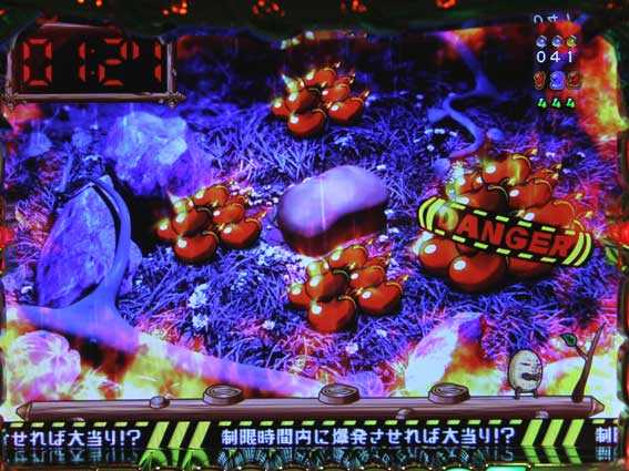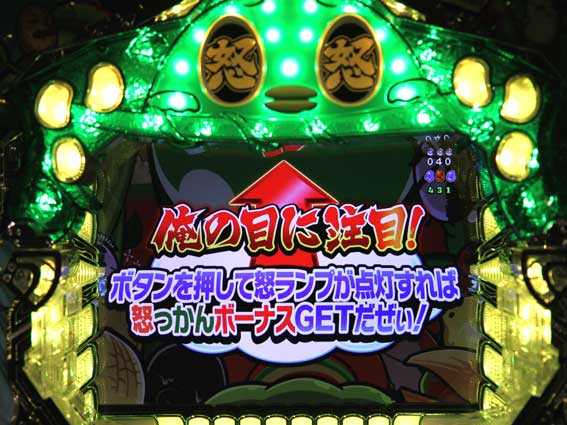 怒豆ミッションに成功すると発生。ボタンPUSHで液晶上部にある2つの怒ランプが点灯すれば赤図柄揃い&10R確変ゲット。点灯しなければ青図柄揃い&5R大当りとなる。