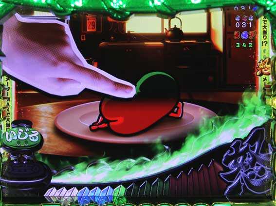 豆図柄がスロー変動するスーパーリーチ。エフェクトの色が赤だとチャンスアップとなる。