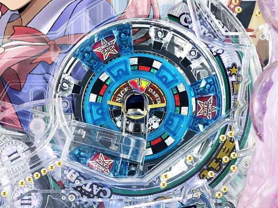 電サポ中は役モノ大当りのチャンスとなるHAPPY END CHALLENGE発生率が大幅アップ。まず盤面右上にある羽根アタッカーに玉を入れ、玉が入賞すればそのまま液晶右下にあるダーツ役モノへ。円盤型のダーツ役モノは内側と外側の2つの円盤で構成され、外側にある「NAICE CATCH」と書かれた赤ポケットに玉が入ればチャンス。反時計回りで上方向に持ち上げられた玉が内部円盤の「V」に入賞すれば大当りとなる。玉を運ぶレールが中央へ導いてくれるチャンスパターンもあるぞ。