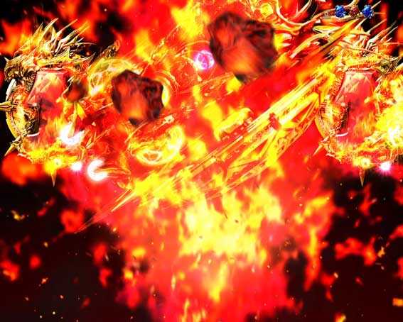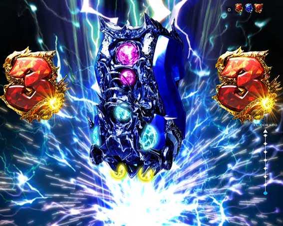 エルドラゲーム中の大当りはすべて15R。ラウンド中は3R目or9R目にバスカの刻演出が発生し、液晶下からせり出した役モノの赤い枠に赤玉が入ればエルドラゲーム継続だ。ただし、失敗してもエンディングで復活継続となる可能性アリ。