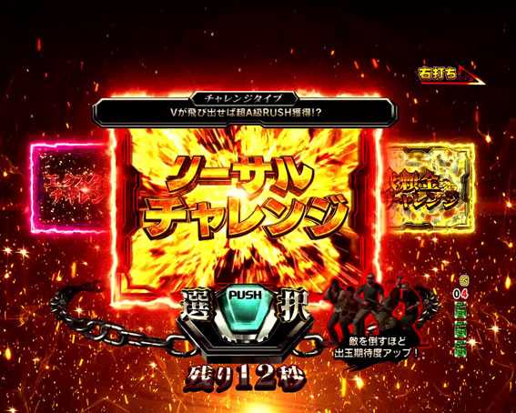 時短中の図柄揃いで発生する超A級チャレンジにていずれかのチャレンジを選択後、V表示失敗で発生する5R大当り。終了後は運命チャンスに突入。