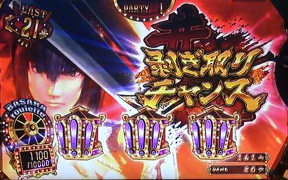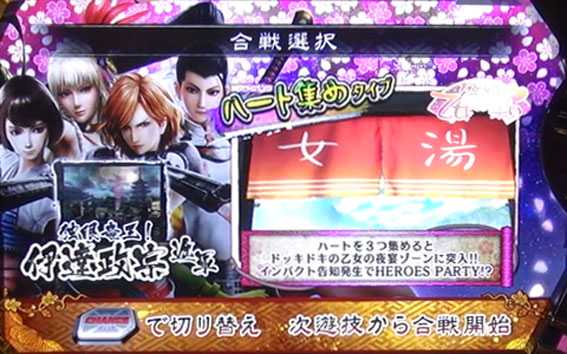 | 備考 | ★内部抽選システムは 「独眼竜王!伊達政宗進軍」と同じ ★ハートを3つ貯めると乙女の夜宴ゾーン突入& HEROES PARTY突入のチャンス |