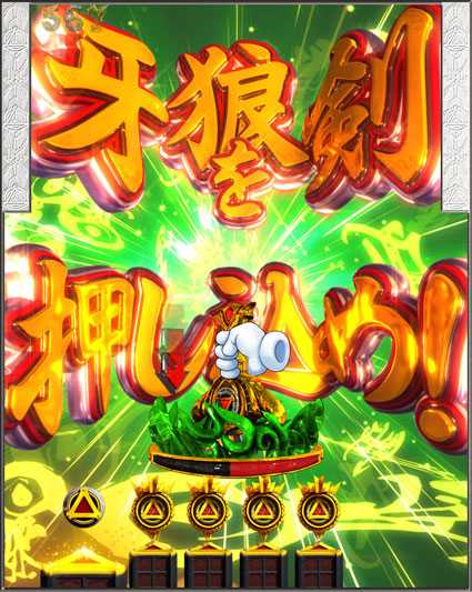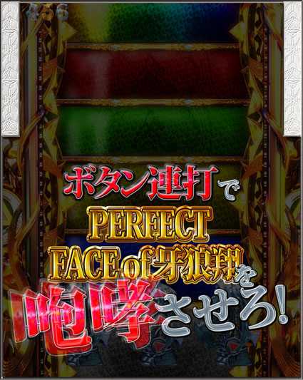 「牙」「狼」「翔」図柄停止で発展する特殊リーチ。「初代枠パターン」と「金色枠パターン」の2種類があり、前者の方が信頼度が高い。
