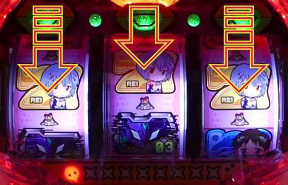 | 中段にキャラ図柄(レイ・アスカ・シンジ)が並ぶと リールが消灯し、ドックンリーチに発展!? |