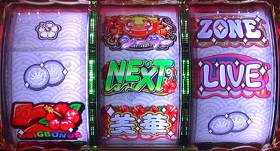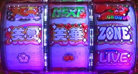 美夏美華チャンス目演出で、右リールに「LIVE」図柄が止まると発展。リーチ中は中リール中段に「NEXT」図柄が多く停止するほど信頼度もアップする!?