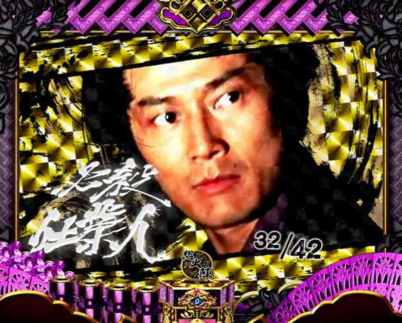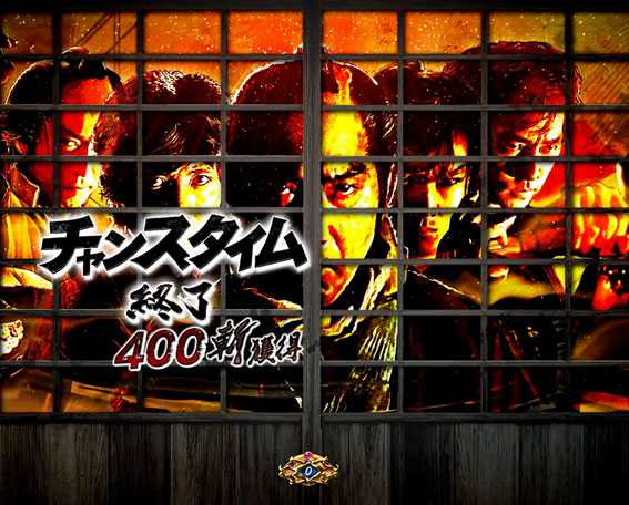 | キャラ図柄チャンス目予告 (一・三・五図柄停止)で、 図柄が実写掛け軸図柄に 変化した瞬間に 激震剣ボタン押下 |