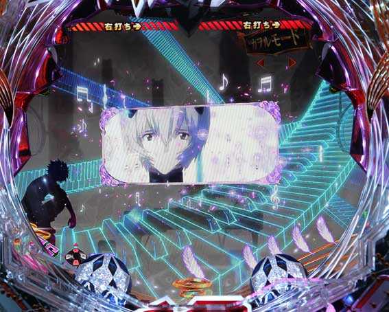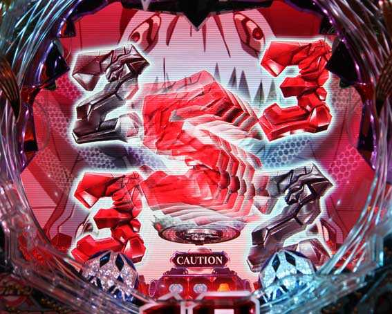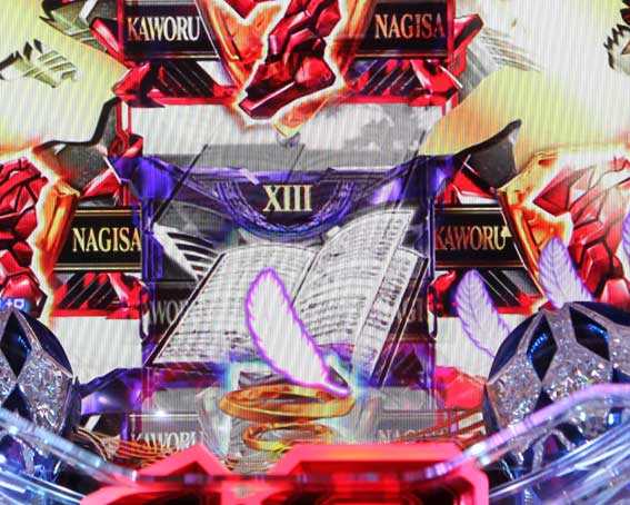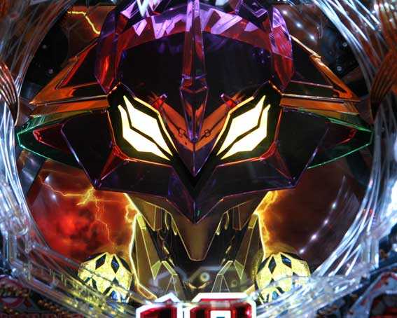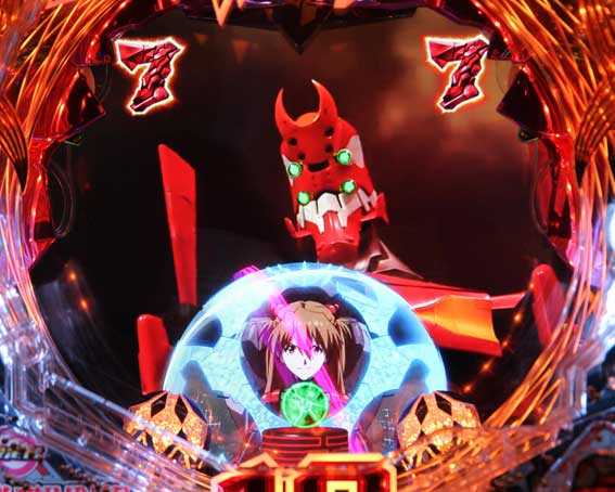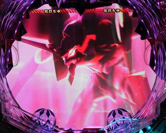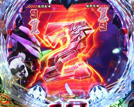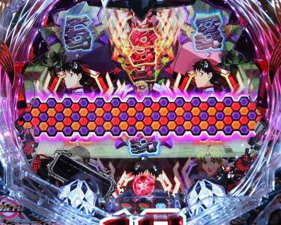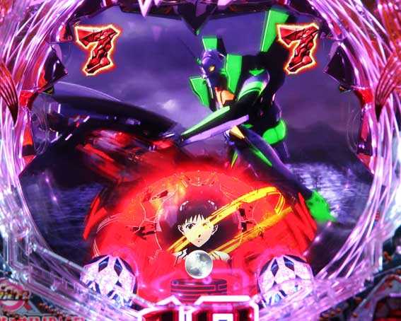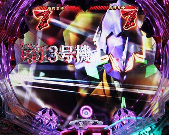 本機の図柄揃い直後の再抽選演出では、初号機ではなく第13号機が登場して揃った図柄が縦にスクロールする。最終的に赤図柄揃いになれば4R確変、ⅩⅢ図柄揃いになれば10R確変昇格だ。