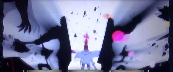 白鯨とのバトル開始前に出現する1枚絵は、背景の色が撃破期待度(青<緑<赤<虹)を示唆。