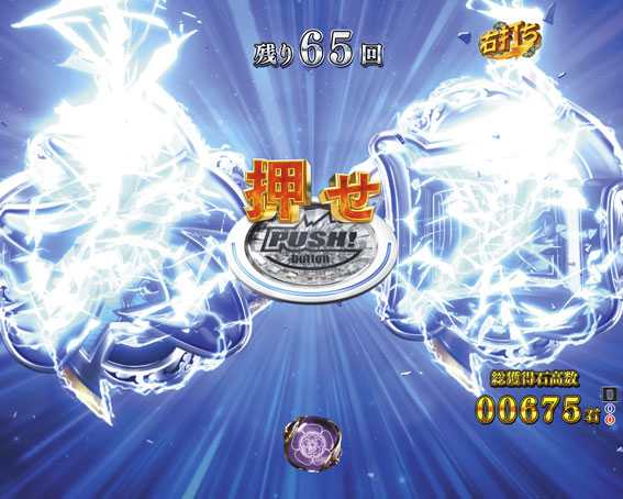 ボタン連打でハズレ図柄の並びを破壊していくアクション。RUSH図柄揃い(2R確変大当り)の当選契機であるが、数字図柄揃いの大当りが当選することもある。