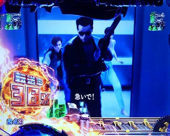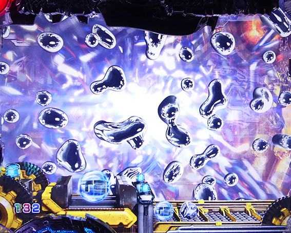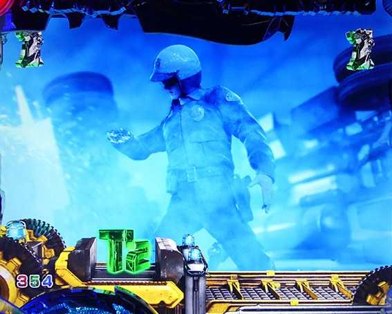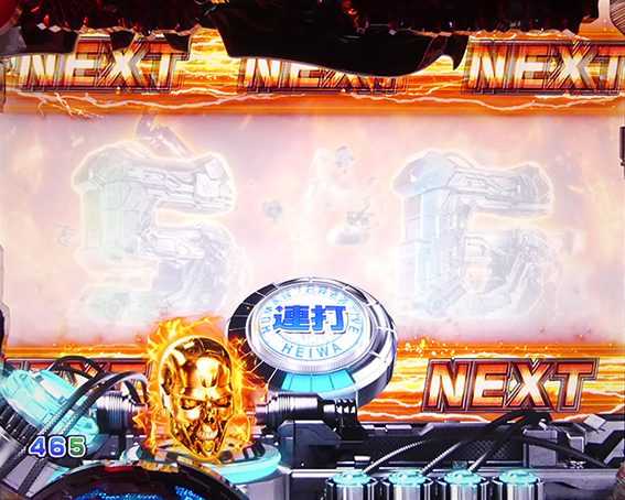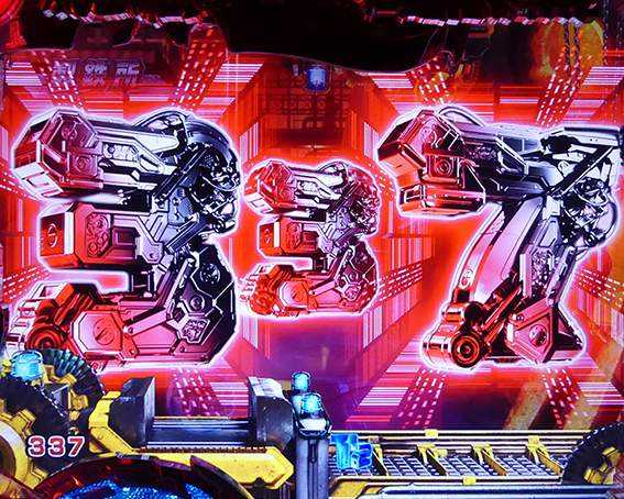 突如レバーが出現するチャンスリーチ。引いて役モノが発動すれば「TRIPLE HYPER BONUS」濃厚だ。時短中のリーチの中では信頼度が高く、「T-1000撃破リーチ」の2人同時攻撃時に匹敵する。