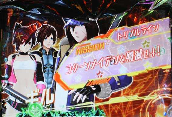 人気ゲーム「ゴッドイーター」シリーズのタイアップマシン。本機は大当り確率1/319.68のミドルスペックで、初当りはすべて10R大当りに。その50%で時短「神バトルRUSH」へ突入するぞ。神RUSHは91%という高継続率を誇っており、RUSH中の大当り(実質10 or 7 or 4R)は必ずRUSH突入となるので、一旦突入すればロングループ&大量出玉獲得の可能性大となる。