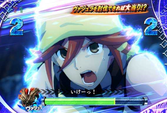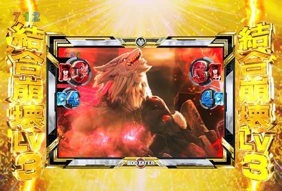 時短1回転目の演出で、約10秒で決着するハイスピードバトルが魅力。アラガミとの対決に勝てば大当りで、神バトルRUSH継続となる。