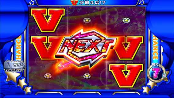 ボタン連打で役モノに「V」の文字を点灯させればATゲット。発生時に出現するロゴの色に注目しよう。
