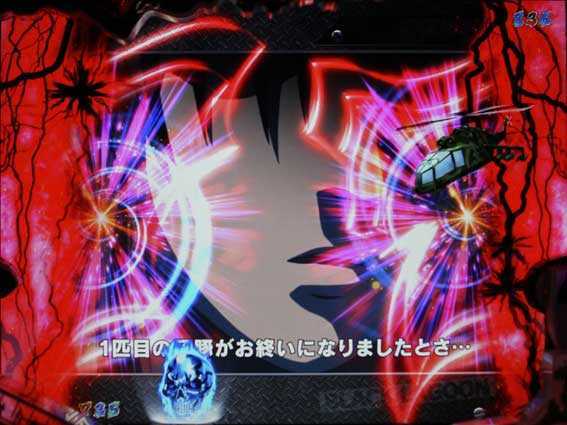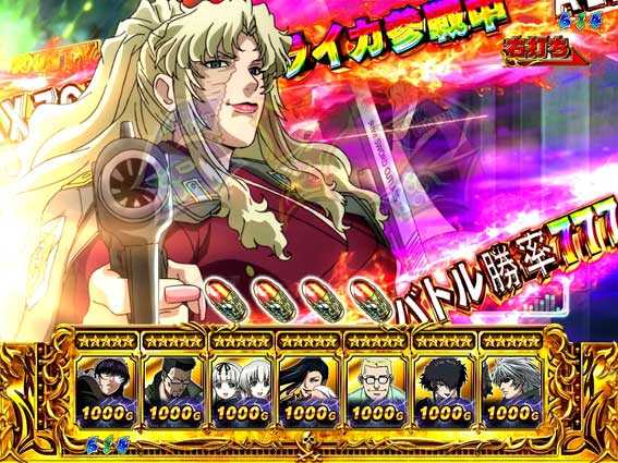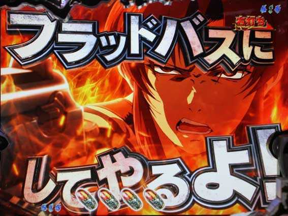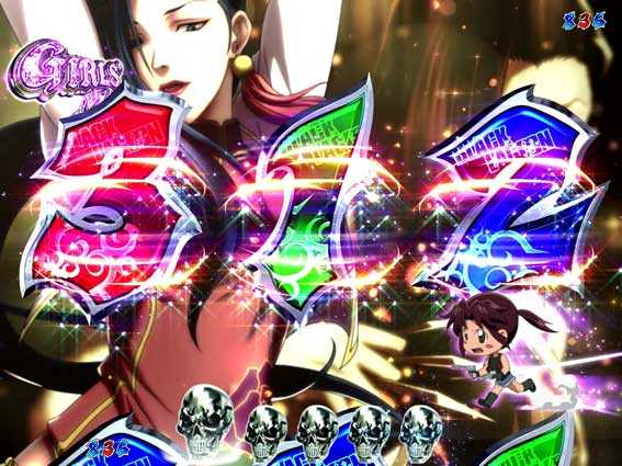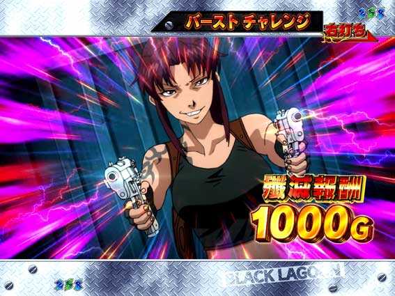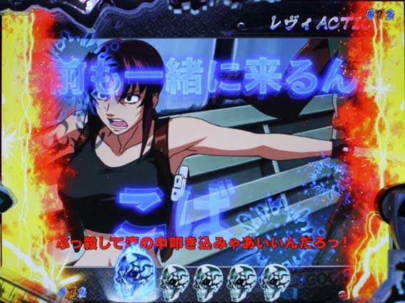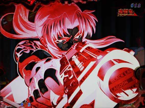連続予告4回などから発展。レヴィとロックのやりとりと共に図柄が全回転で移行する。7図柄大当り濃厚!?