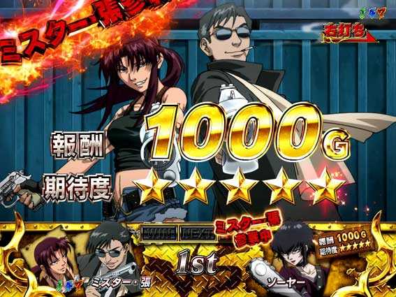特殊図柄停止やラグーン商会リーチなどを経由して発展する本機最強リーチ。原作のエピソードで展開するリーチ演出は3種類で、「ミスター・張」<「バラライカ」<「レヴィ」の順に信頼度が上昇する。チャンスアップにはテロップや羽根の色、ドライブギアの種類などがある。