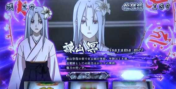 青7揃いの喰霊BONUS終盤では、キャラ紹介画面が2回出現。1人目と2人目のキャラの組み合わせによって設定が示唆されるぞ。1人目と2人目がどちらも赤背景、または2人目が三途河(金背景。1人目のキャラ不問)なら設定5以上濃厚だ!