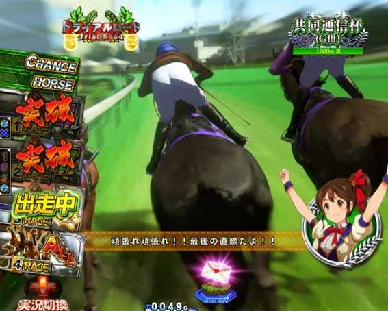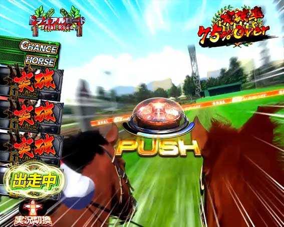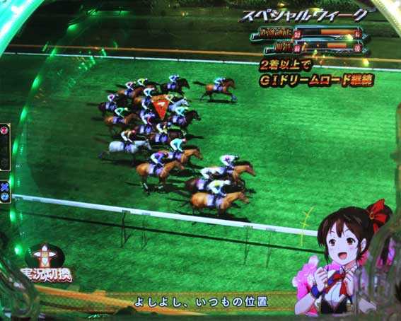 消化中はレース演出が発生すればリーチとなり、1着になれば10R確変&GIドリームロード継続。2着でも3R確変&GIドリームロード継続となる。3着になると3R通常&通常時に戻る。