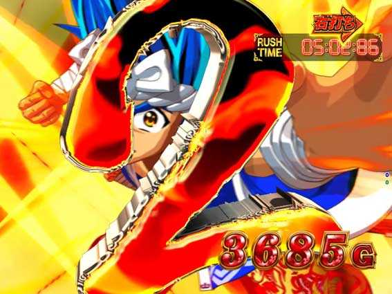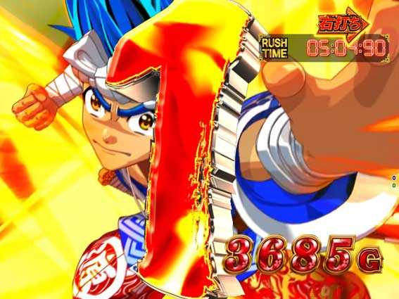 初回7以外の図柄揃いの場合は超源チャレンジに成功すればRUSHに突入。7図柄揃いorロングフリーズ(小当り)の場合はRUSH直行となる。RUSHは時短3回転+残保留1個で、計4回転の間に大当り確率約1/2.06を引けば大当りとなるので継続率は約93%と優秀。ただし、RUSH中の大当りは3Rがメインのため、連チャン中にいかに多く9Rを引くかが勝負のポイントとなる。