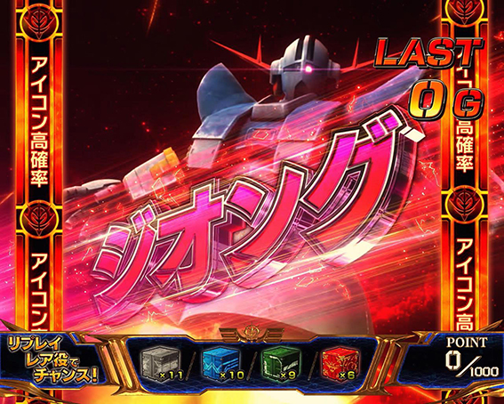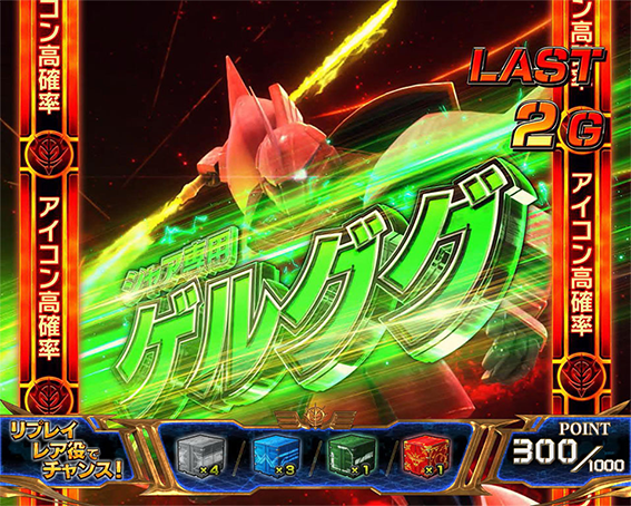 1戦目開始時にMAXチャレンジの帯が出現したら有利区間完走の大チャンス。AT当選時はネオジオンRUSH MAXへ突入するため、是が非でも勝利を掴みたい。なお、バトル敗北しても次回MAXチャレンジ滞在の可能性は残るぞ。