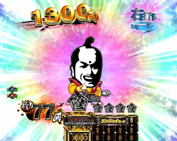 初回大当りの99%が、終了後に出陣チャンスへ突入。ココで当たれば真仕置CRASH TURBOへ突入するぞ。液晶では一騎打ちリーチがメインで展開され、鉄が敵に競り勝てば大当りとなる。