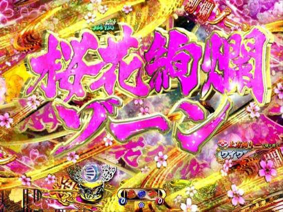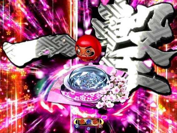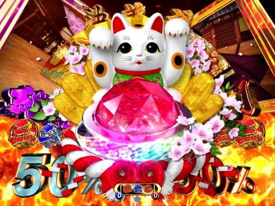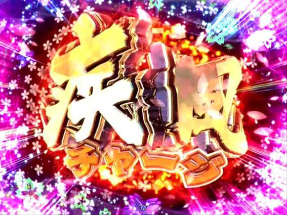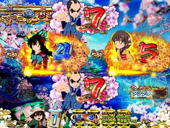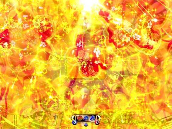 赤図柄揃いへの昇格演出が展開。お華エフェクトの色が赤ならチャンスアップだ。