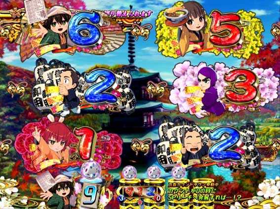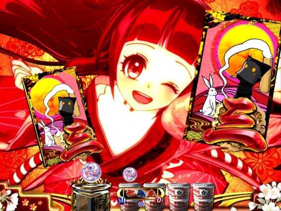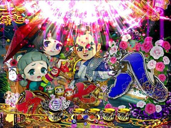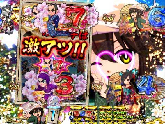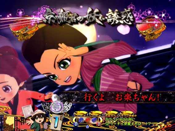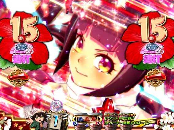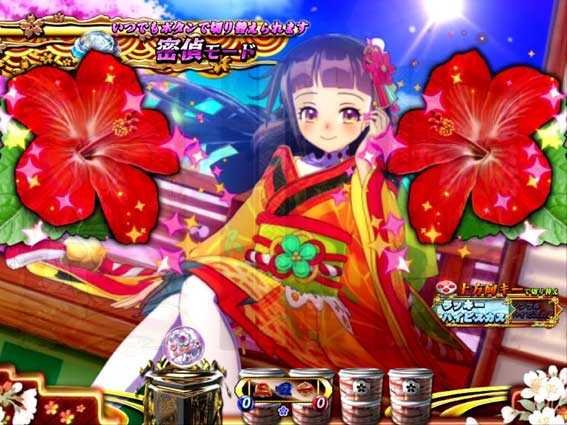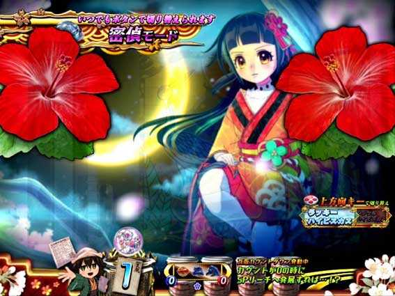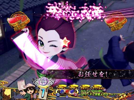 液晶右にいるお華の動きに注目。見慣れないアクションをすれば確変大当りのチャンス!?