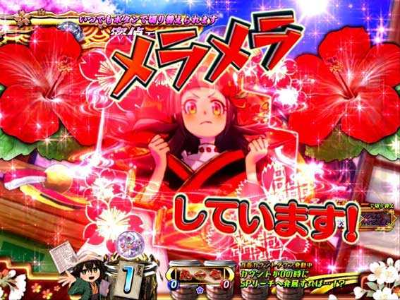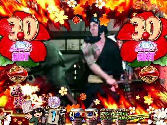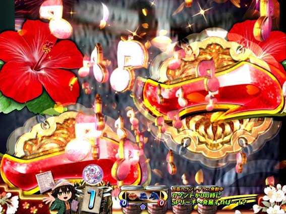 本機の時短は100回転を超えても続く可能性があるのが特徴で、大当り後なら最大で300回転継続。通常時の760回転ハマリから突入した場合は超高確率(約97.8%)で時短中に大当りが発生する。なお、液晶では通常時の密偵モードと同様の演出が展開。もちろんハイビスカスが光れば大当り濃厚だ。