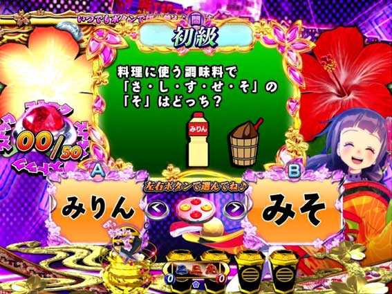 クイズが出題されたら左右キーで答えを選択しよう。なお、問題の難易度は基本的に「初級~神級」(液晶上部に表示)だが、「ぷれみあむ」なら確変大当り濃厚!?
