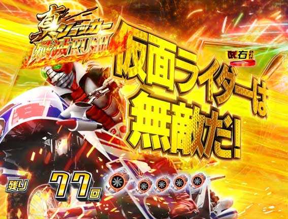 電サポ中のライダーボーナスは2R確変&ST突入となるが、ラウンド中に轟音ライダーボーナスへ昇格する可能性もアリ。