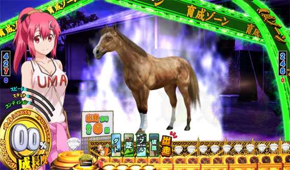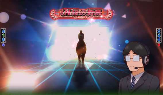 画面割れ演出から発展。伝説の名馬を呼び出すことができれば大当り。ボタン長押しでエフェクトの色が変化するほどチャンス!?