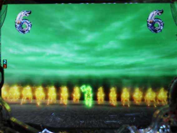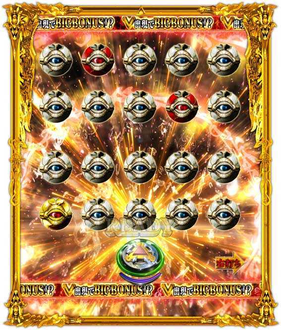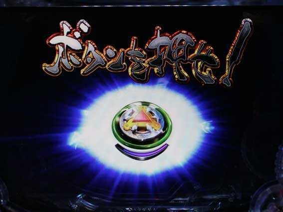 光矢流星予告の演出成功から発展。ボタンを押してフェイスオブガロが完成すれば大当りだ。