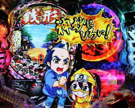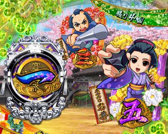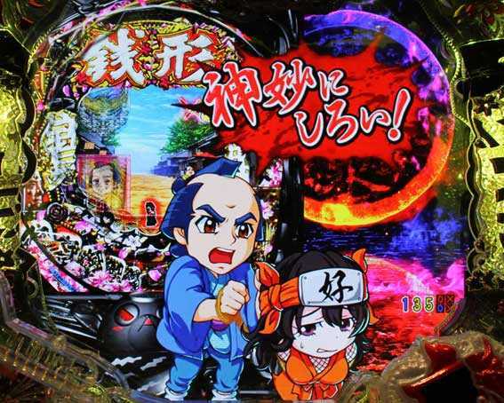 SP発展時は銭形ロゴによるステップアップ演出が発生。落下(技SP)→回転(乱戦SP)→全可動(鬼面組御用)とステップが進むほど発展リーチがランクアップする。