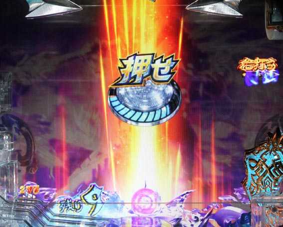 | 変動中にPUSHボタンを押して 盾ギミックが虹色に光る |