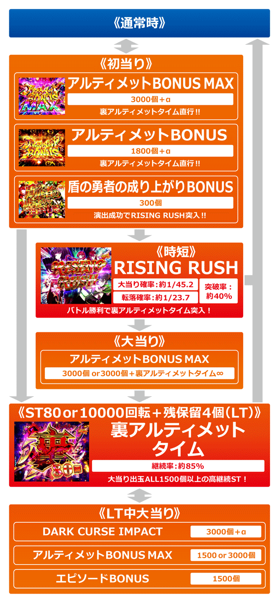 盾の勇者の成り上がりBONUS当選⇒ラウンド中演出成功⇒RISING RUSH中に大当り⇒裏アルティメットタイム突入…というのがLT発動までの基本的な流れ。なお、初当りからLTへ直行するルートもアリ(全初当りの2.1%)。