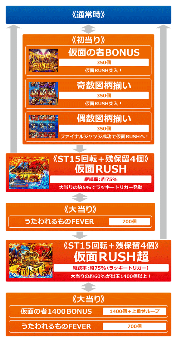 継続率やST回数は仮面RUSHと同じだが大当り振り分けが大きく異なり、大当りの半数が1400個+上乗せループとなる。なお、発生する予告&リーチについては仮面RUSHと同じで、信頼度も共通となっている。