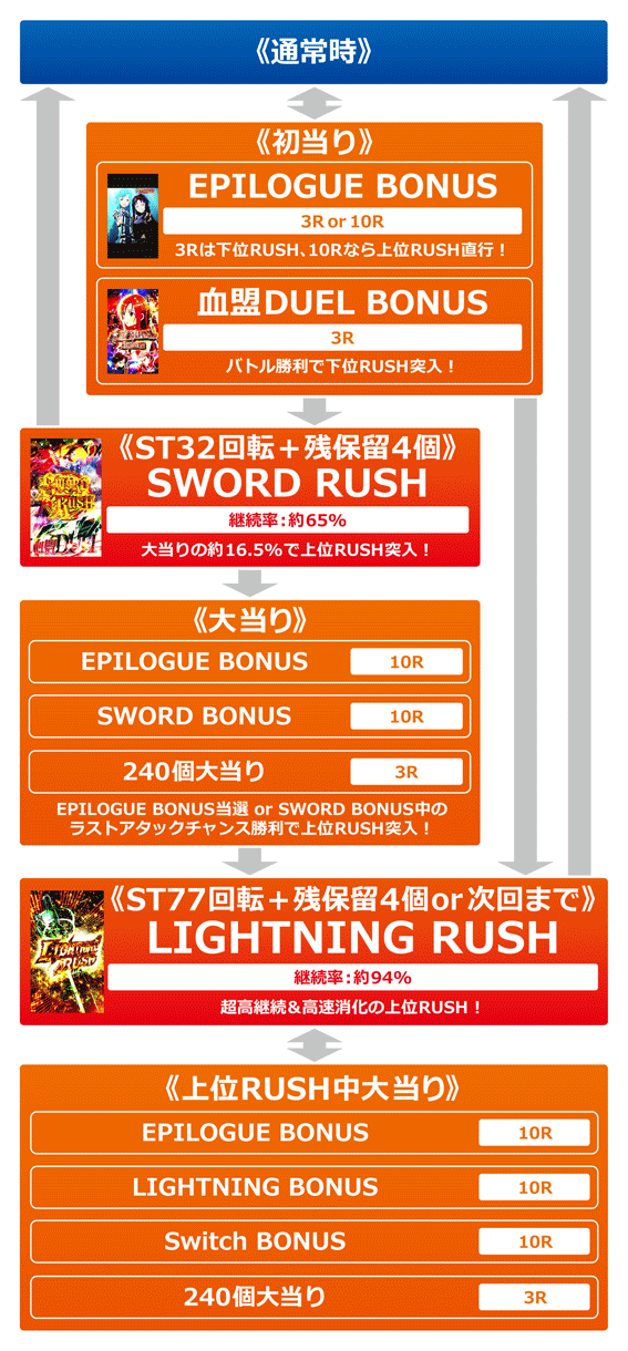 SWORD RUSHはST32回転の右打ちモードで、EPILOGUE BONUS当選、または10R大当り中のラストアタックチャンス成功でLIGHTNING RUSHに突入する。