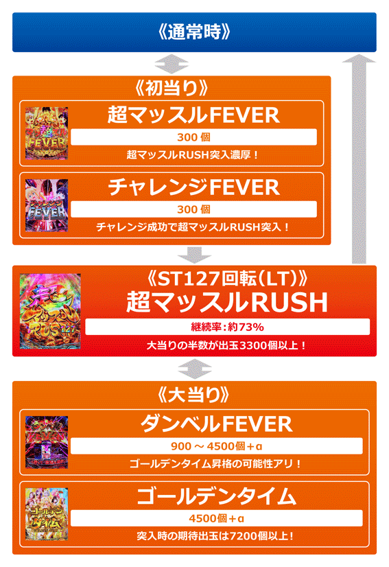 初当りの約25%でLTに突入する直LTタイプ。LT「超マッスルRUSH」は127回転のSTタイプで継続率は約73%。大当り当選時は半数が出玉3300個以上、かつその一部でゴールデンタイムへ突入し、4500個+αを獲得できるぞ。