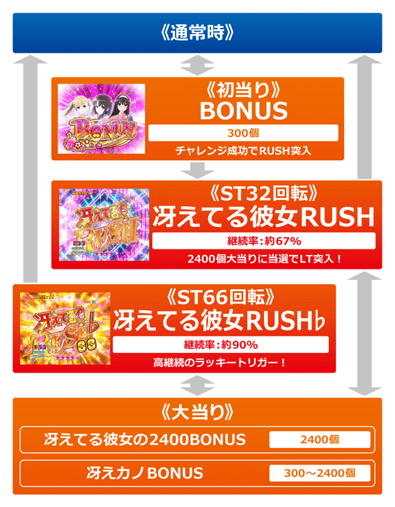 LT「冴えてる彼女RUSH♭」は継続率約90%の66回転ST。大当り振り分けはRUSHと同じで、全大当りの12.5%が2400個となる。