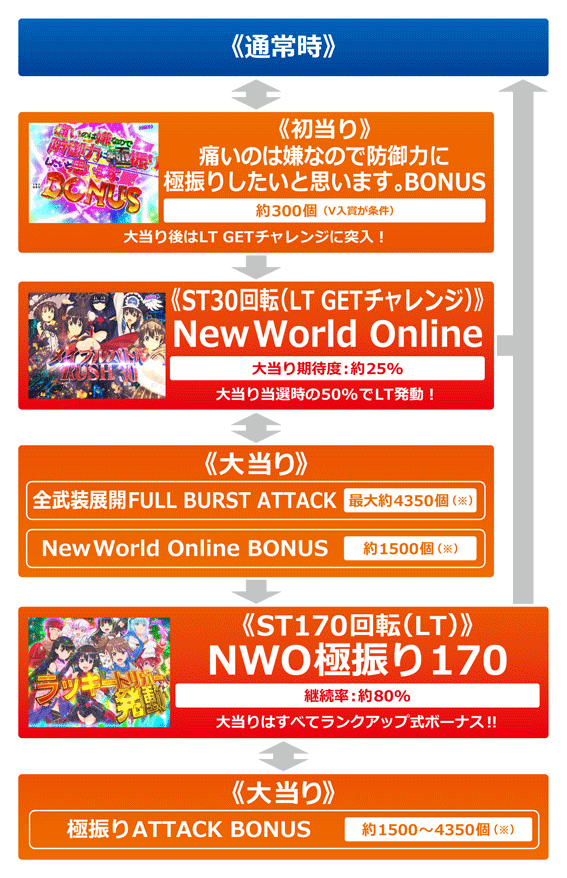 すべての初当り後にLT GETチャレンジ「NewWorld Online」(以下「NWO」)へ突入。NWOは30回転のSTで、大当り期待度は約25%と決して高くはないが、当たれば50%でLTが発動する。