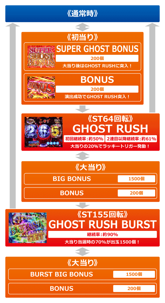 初当り後は50%でメインST「GHOST RUSH」(64回転)に突入。メインSTは初回突入時と2連目以降で継続率が変わるが、連チャン数を問わず大当りの20%でラッキートリガーに突入する。