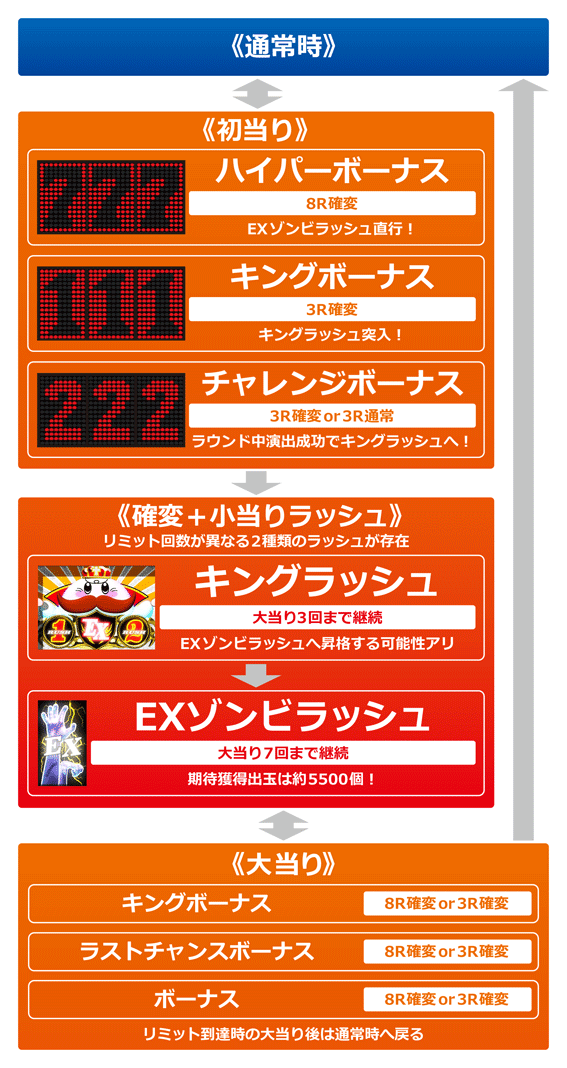 なお、セグでは3回リミット時はキングラッシュ、7回リミット時はEXゾンビラッシュが展開。キングラッシュでも内部的に7回リミットである可能性があり、その場合は大当り中などにEXゾンビラッシュへ昇格する。