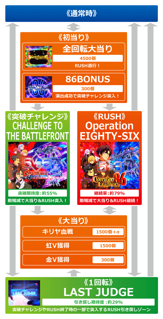 初当り後は約54.5%で突破チャレンジ「CHALLENGE TO THE BATTLEFRONT」に突入し、敵部隊を殲滅できれば大当り&RUSH「Operation EIGHTY-SIX」に突入(突破期待度は約55%)。