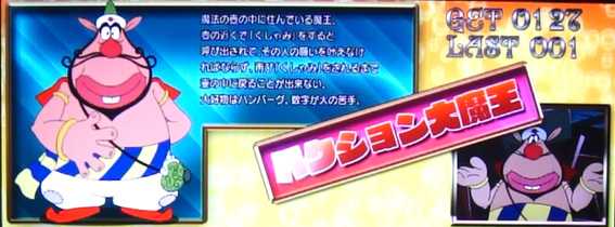 | 備考 | ★カンちゃんがくしゃみをすれば RT突入濃厚 ★くしゃみをしたゲームでは RT40G獲得をかけて目押しに挑戦 ★目押し成功で40GのRT、 失敗で20GのRTに突入 ★パパ&ママ出現時は3連魔王狙いでも 目押しさえ成功すればRT40Gゲット ★くしゃみが発生せず10Gを消化すると 通常時に戻る |