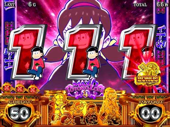 人気アニメ「おそ松さん」とのタイアップマシン。純増約5.0枚の高性能ATを搭載しており、ゲーム数解除やCZから擬似ボーナス当選を目指すゲーム性となっている。CZは3種類存在し、「O-STOP」は液晶上で図柄が揃えばボーナス濃厚。「おそ松チャンス」と「F6チャンス」は突入した時点でボーナス濃厚となり、おそ松チャンス中は6つ子全員集合で神松BB当選濃厚、F6チャンスはBB複数ストックの期待大だ。