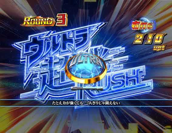 通常時に青or緑図柄が揃うと発生する4R大当り。ラウンド中は専用のボタン演出が展開し、演出成功でウルトラ超光RUSHに突入。失敗すると通常時に戻る。